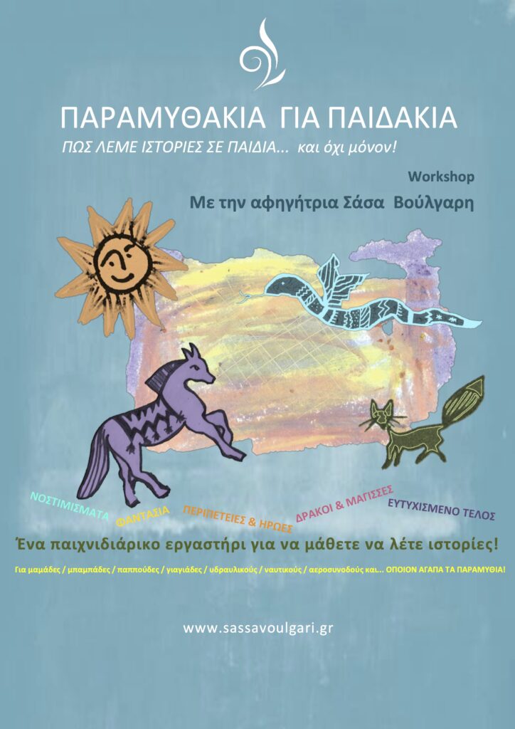 Είναι μεγάλο… «παραμύθι» η πεποίθηση ότι τα παραμύθια φτιάχτηκαν για μικρά παιδιά. Η ιστόρηση ήταν μια ψυχαγωγία που επινόησαν οι ενήλικες και καταρχήν απευθύνονταν σε ενήλικες. Υπάρχει, φυσικά, κι ένα πλούσιο και θαυμάσιο προφορικό αφηγηματικό υλικό ειδικά για παιδιά! Οι παραδοσιακές ιστορίες είναι φτιαγμένες με τρόπο στέρεο, ασκούν το μυαλό, και τον ορθό τρόπο σκέψης, γιατρεύουν και ηρεμούν το πνεύμα και απηχούν πανάρχαιες αλήθειες που μιλούν σε όλες τις ηλικίες. Ελάτε να δούμε μερικά από τα μυστικά των παραμυθιών μαζί, παίζοντας και γελώντας, λέγοντας παραμύθια, φτιάχνοντας παραμύθια…