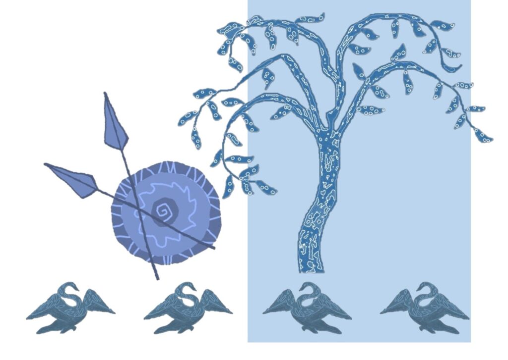 Δυνατά λαμνοκοπούσαν οι ήρωες, κι έσκιζε το γοργό καράβι τα νερά σαν αητός! Θεόρατα κύματα τους χτυπούσαν από παντού, λυσσομανούσε η θάλασσα και ο αλμυρός αφρός της, τους έλουζε. Πλησίαζαν σ΄ εκείνο το σημείο που δυο θεόρατα βουνά χτυπιόταν με μανία και κοφτερά τα βράχια σαν ατσάλινα δρεπάνια περίμεναν να τους συντρίψουν αδυσώπητα. Ο Ιάσονας χάιδεψε μαλακά το όμορφο πουλί κι ύστερα άφησε το περιστέρι να πετάξει…